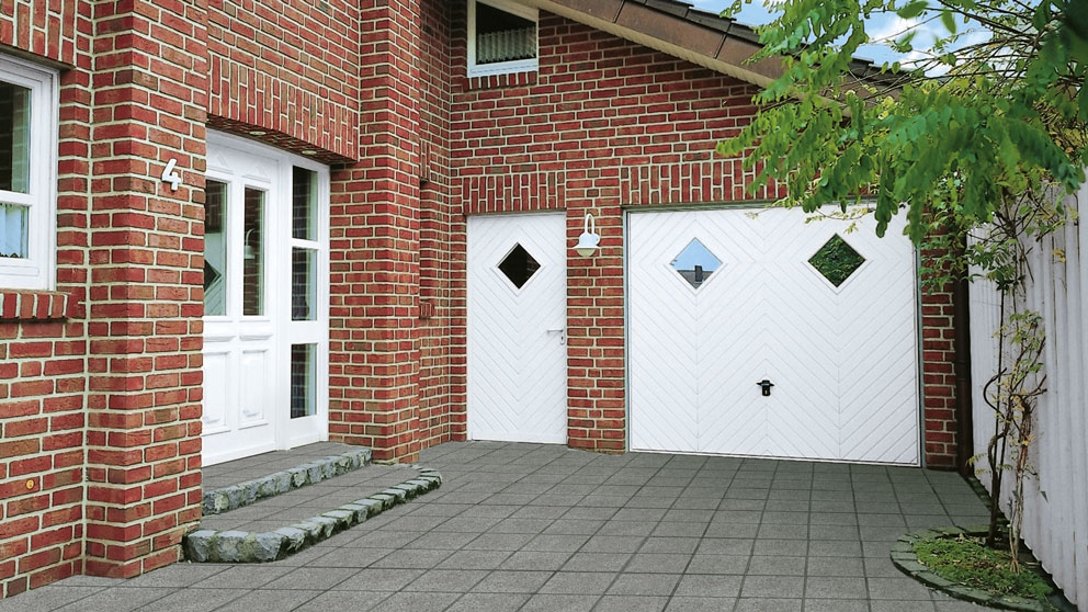 Das klassische Garagen-Schwingtor schwingt beim Öffnen und Schließen im Vergleich zum modernen Garagen-Sektionaltor aus. Deshalb muss vor der Garage ein geringfügiger Schwenkraum mit einkalkuliert werden.